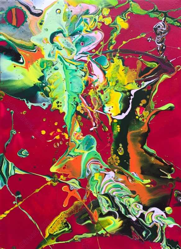 Ayant effectué des recherches, lors de mes études universitaires, sur le rôle du hasard dans la composition artistique, cette notion s’est intégrée tout naturellement à ma démarche de travail, et en est devenue un instrument de création privilégié.Je vais ainsi projeter sur la toile ce qui va devenir une première ébauche, irraisonnée, chaotique, qui sera par la suite réorganisée, afin de créer un univers pictural où subjectivité et éléments aléatoires vont cohabiter pour constituer le langage qui l’animera.