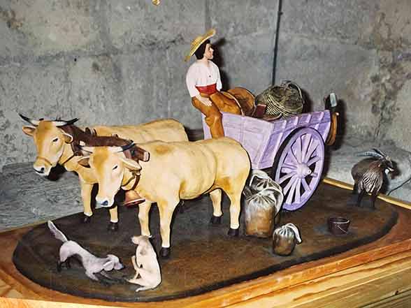 Sculpture en terre cuite peinte à l’huile et vernie composée de 2 bœufs ; une Charrette : de paniers ; sacs de farine ; collier ; deux chiens se grattant ; un bouc et un jeune garçon H 30 L 80 l 40 cm prix NC ; pièce originale