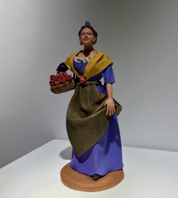 Statuette en terre cuite peinte à l'huile. Habillée à la feuille d'argile. Pièce composée d'une femme arlésienne portant un panier de tulipes sur socle rond. Pièce originale