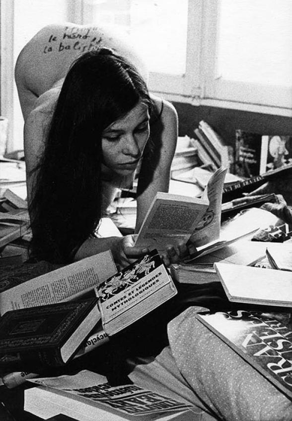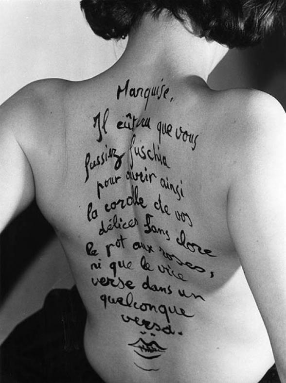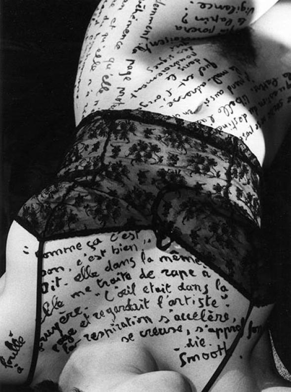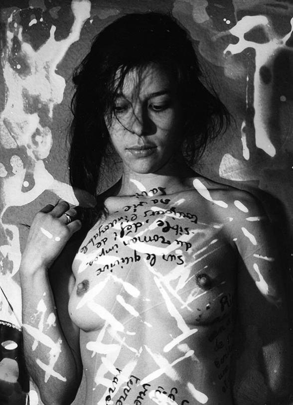 Photo de la série des écriture sur corps à l'encre de chine et au pinceau calligraphique, modèles :Clo et Sophie