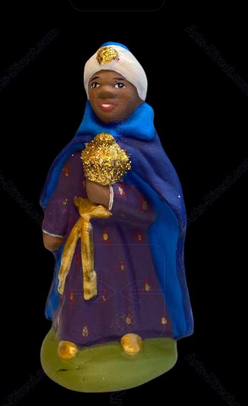 Balthazar est décrit avec un visage noir, il est descendent de Cham, fils de Noé et représente l’Arabie. Il offre de l’or (réservé aux rois), symbole de la royauté de Jésus.