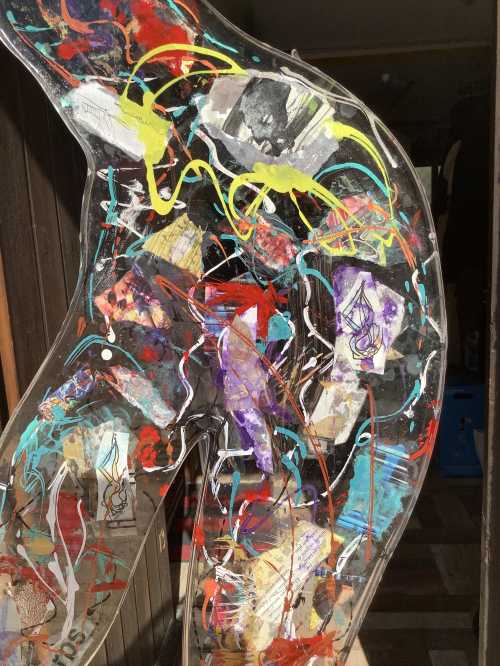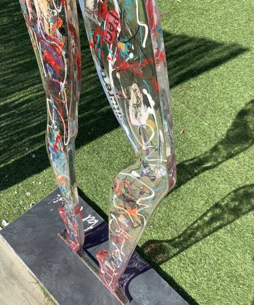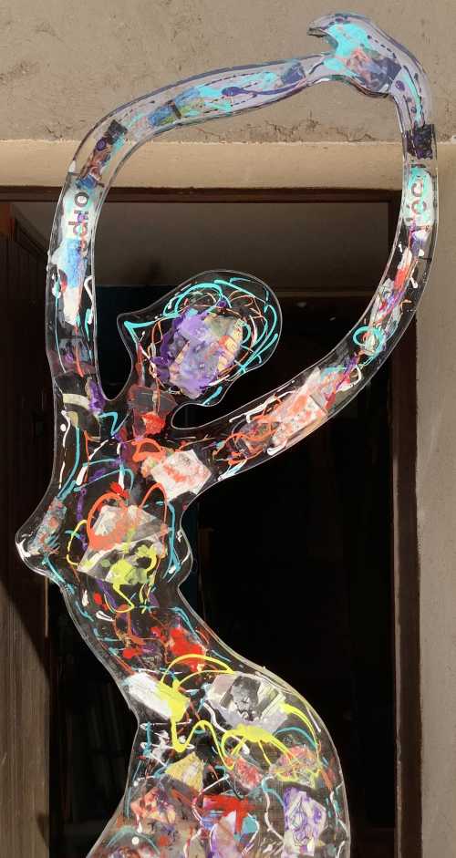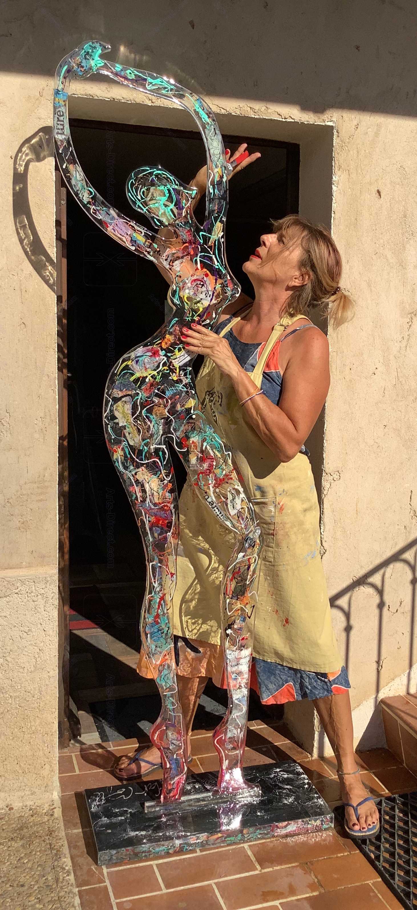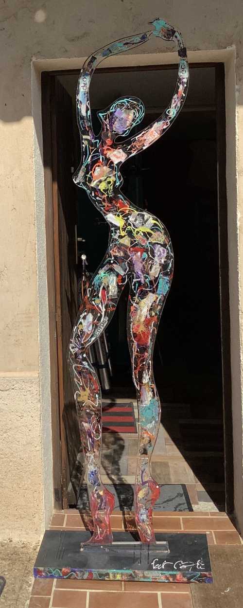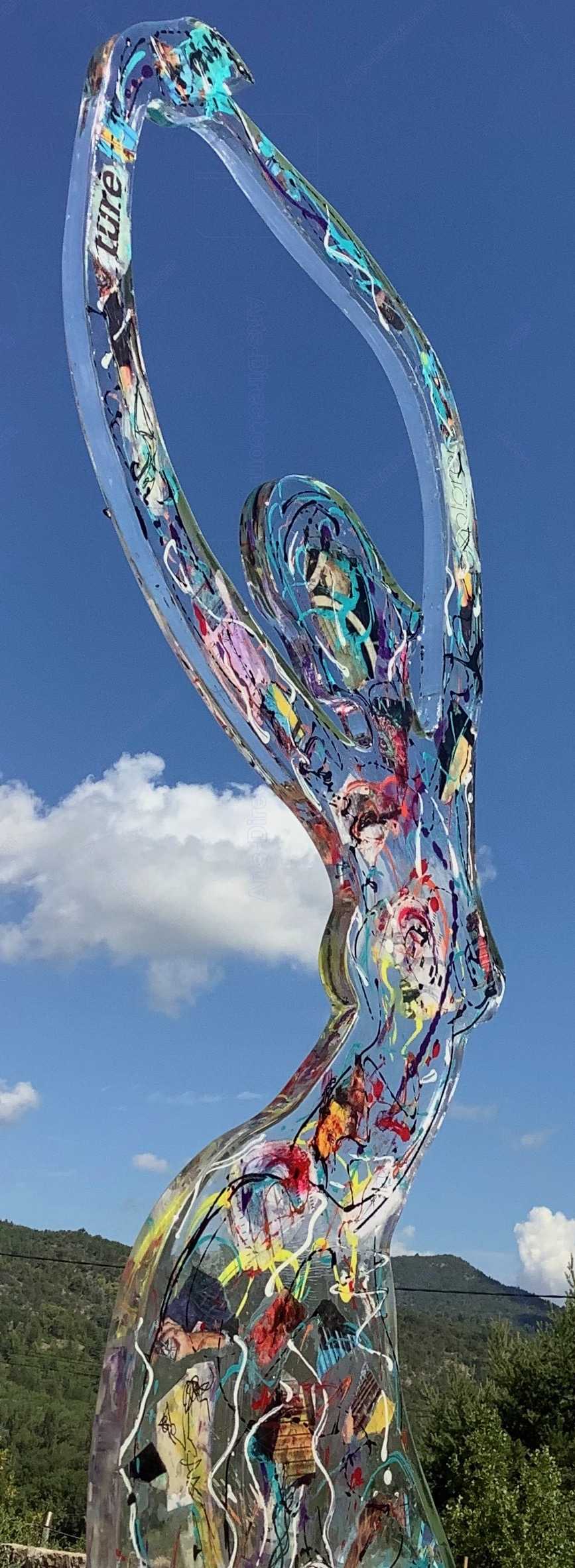 Cette silhouette grand format, à taille humaine joue avec la transparence de la résine et le symbolisme des représentations. PatMoli invente des personnages expressifs qui font partie du quotidien, objets et partenaires à la fois. Dans une position élancée, cette liane aux longues jambes et aux chaussons roses (une des signatures de PatMoli) nous appelle vers une introspection de la beauté et du mouvement : ici celui-ci forme la lettre S. Elle se livre, complice, aux yeux des observateurs qui plongent alors dans sa danse.