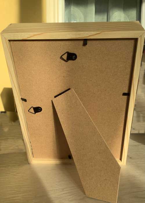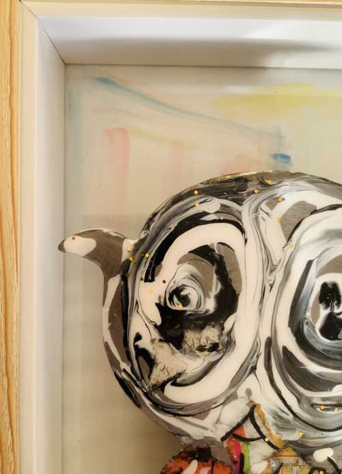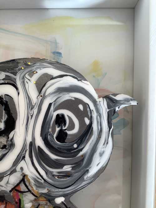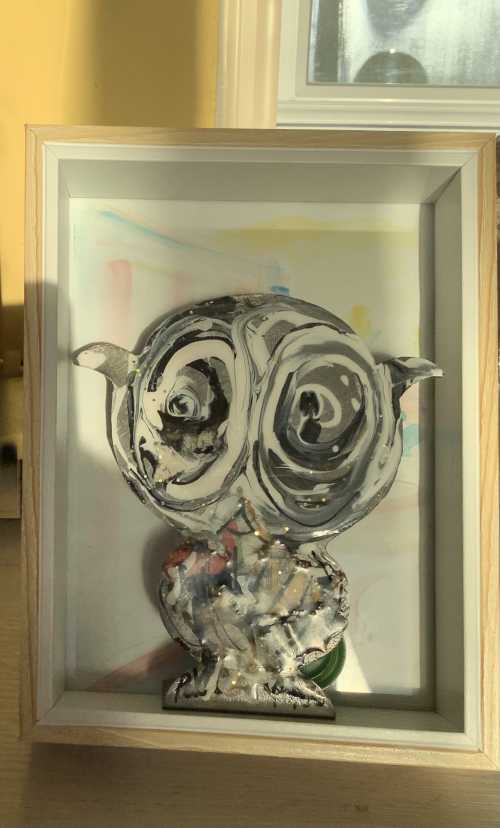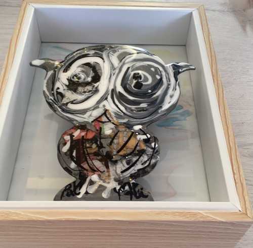 Mini-chouette de 8 cm de hauteur en acier inoxydable, peinte et résinée, dorée à l'arrière dans son cadre en bois et son fond en verre aquarellé.