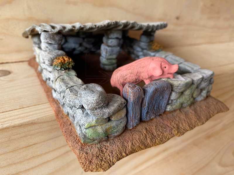 Enclos à cochon, fleur et porte bleue peint, en terre cuite