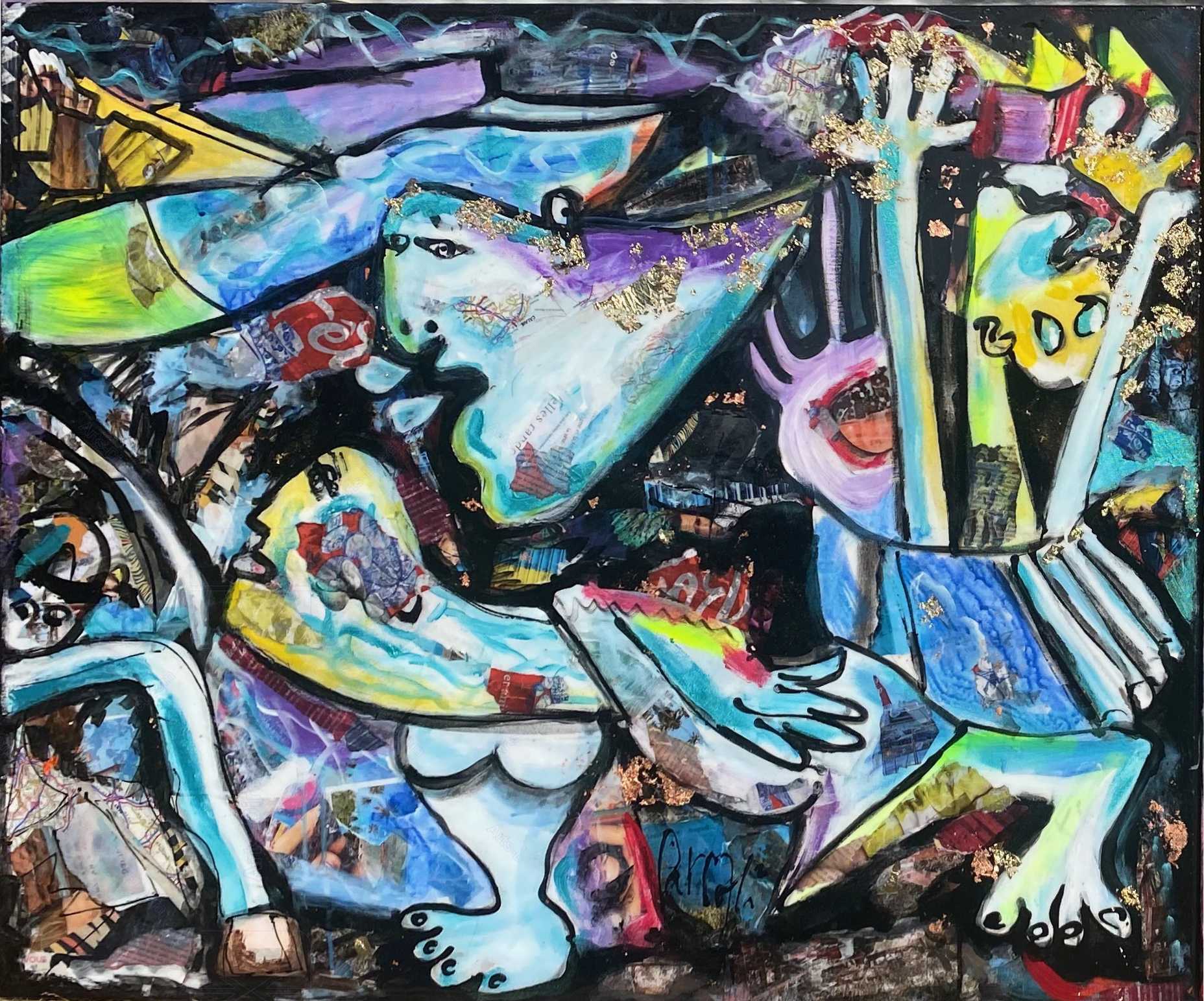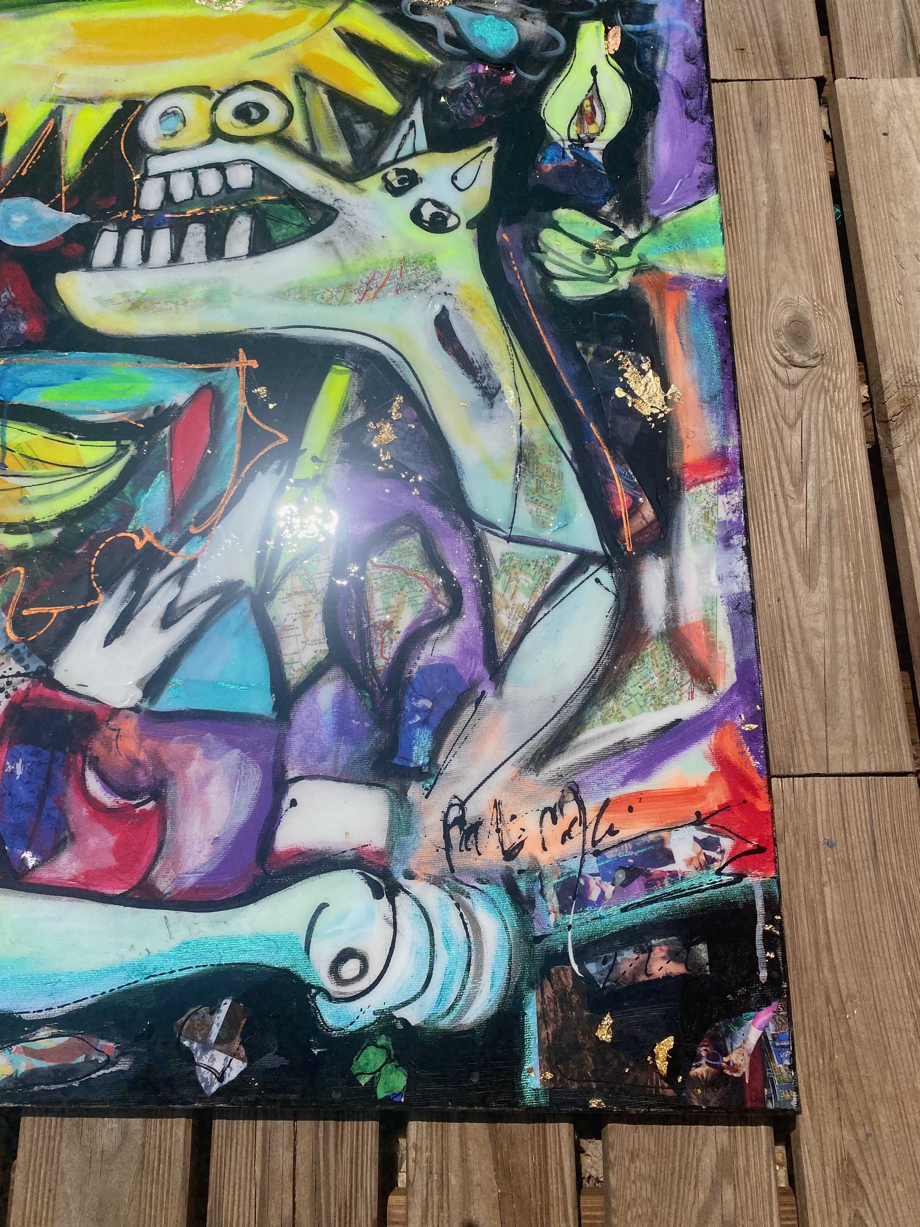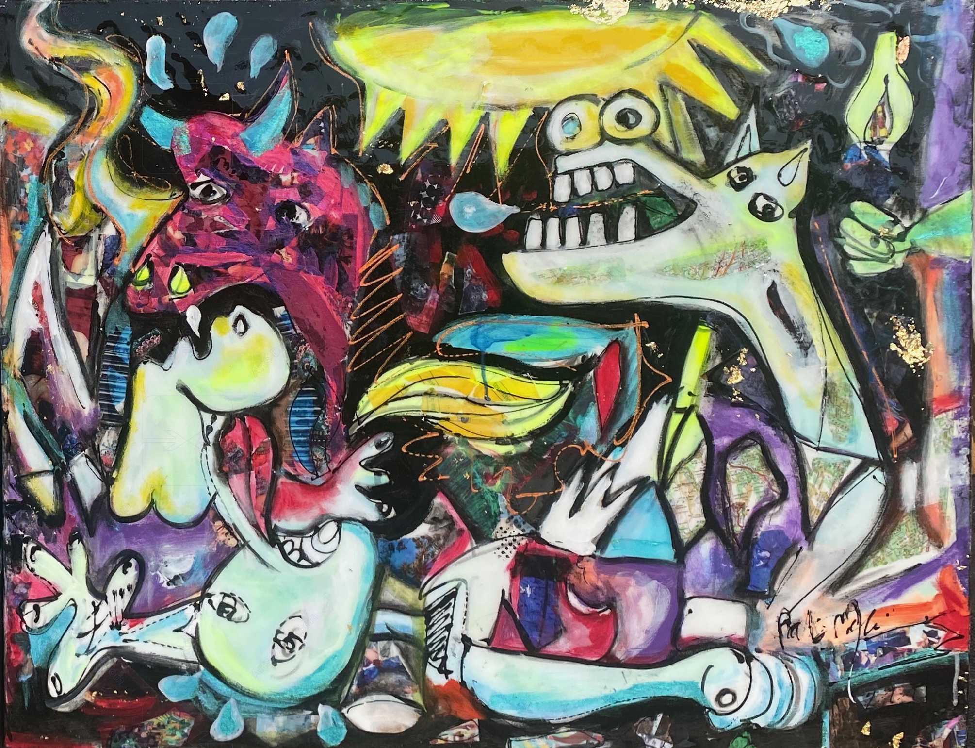 En revisitant la fameuse oeuvre de Picasso " Guernica ", PatMoli ne parle pas de la même guerre que le grand artiste mais de celle de l’eau ! Elle en garde les animaux et personnages criant, une ligne énergique, stylisée, spontanée et colorée au milieu des gouttes d’eau jaillissantes. Ainsi, l’artiste a glissé plusieurs indices reflétant l’état d’esprit de ses inquiétudes et préoccupations sur un sujet bien actuel : le manque d’eau. La guerre fait écho à cette sécheresse lancinante car comment faire sans cette ressource nécessaire ?