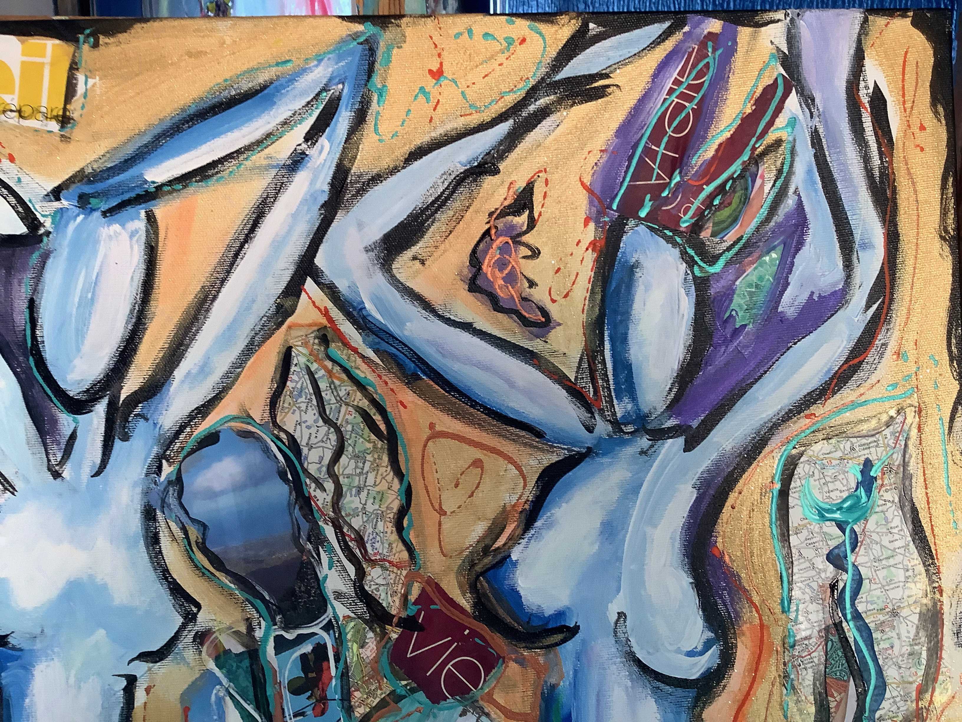 1MX1M : Dans ce détournement des " Demoiselles d'Avignon " de Picasso : cet espace d’intimité où nous conduit l’artiste PatMoli, cinq femmes semblent en harmonie avec leur milieu, libres et assumées. Cependant, l’artiste a glissé plusieurs indices reflétant l’état d’esprit de ces belles rebelles, leur inquiétude et leur préoccupation sur un sujet bien actuel : le manque d’eau. La nudité des demoiselles fait écho à cette sécheresse lancinante car on attend bien qu’elles se baignent, s’aspergent ou se rafraichissent. Mais comment faire sans cette douce ressource ?