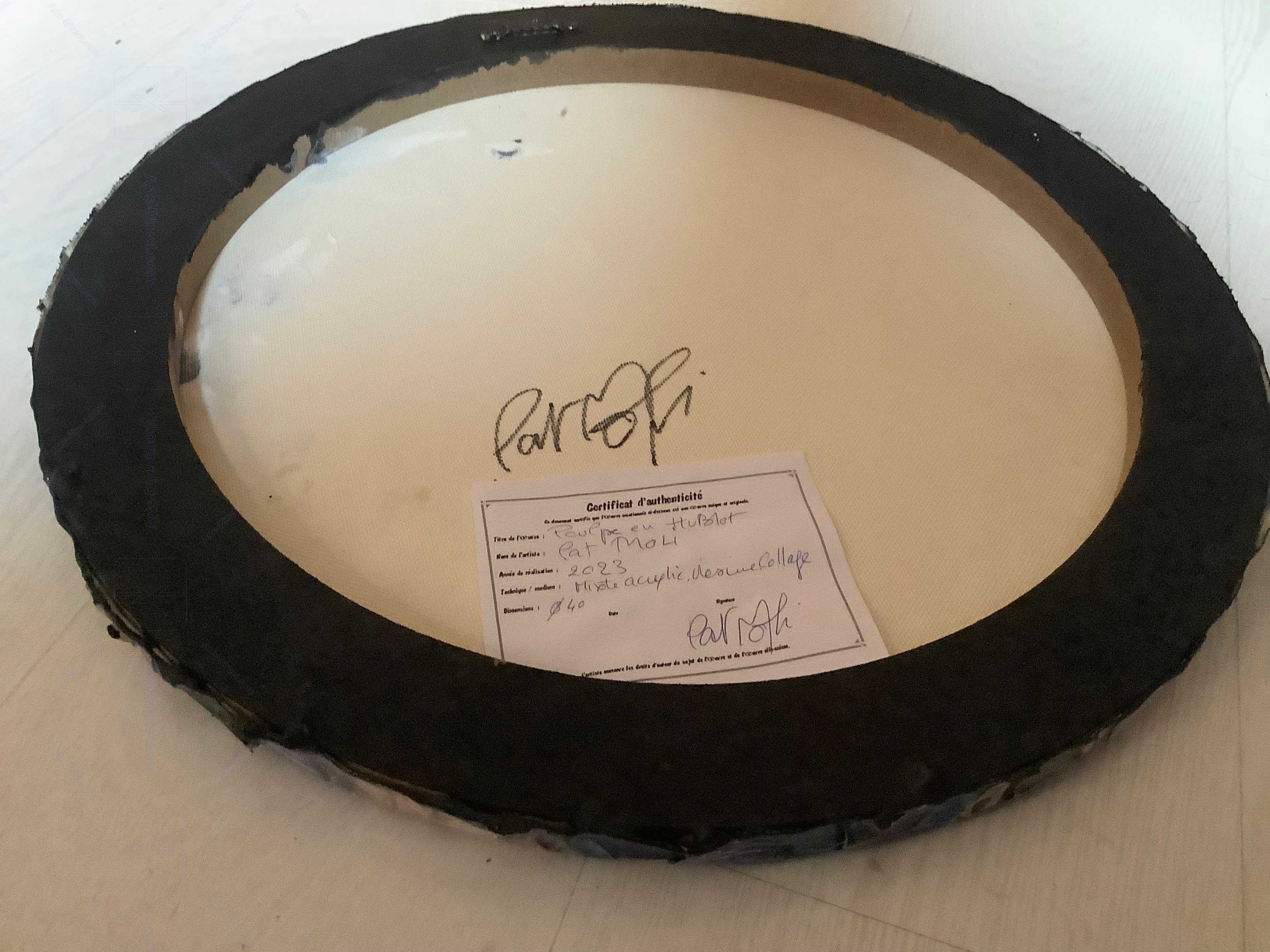 Le poulpe est en relief à 2 cm du support toile sur des plots et les algues sont incrustées dans la résine sur une toile ronde , diamètre 40 cm