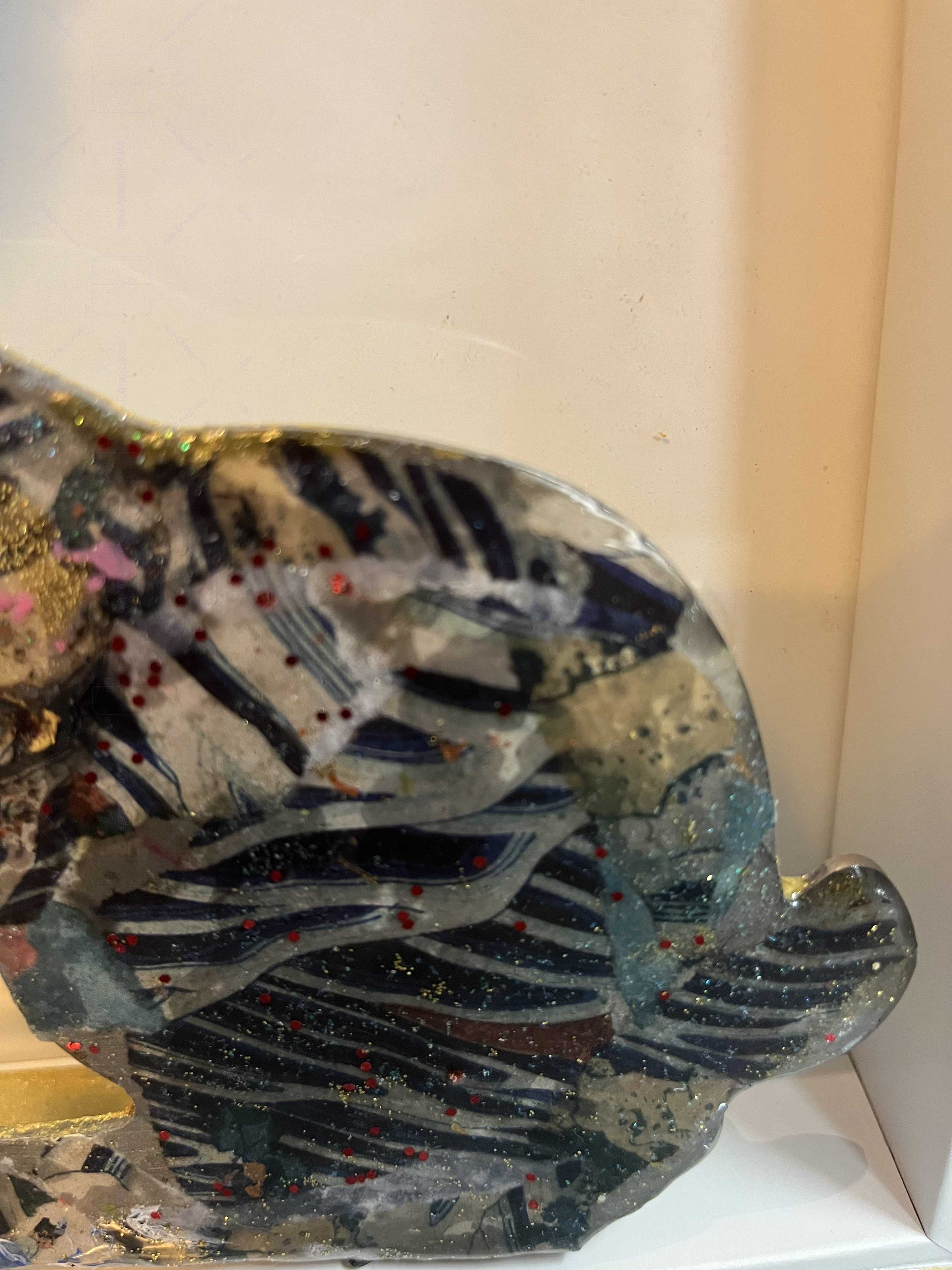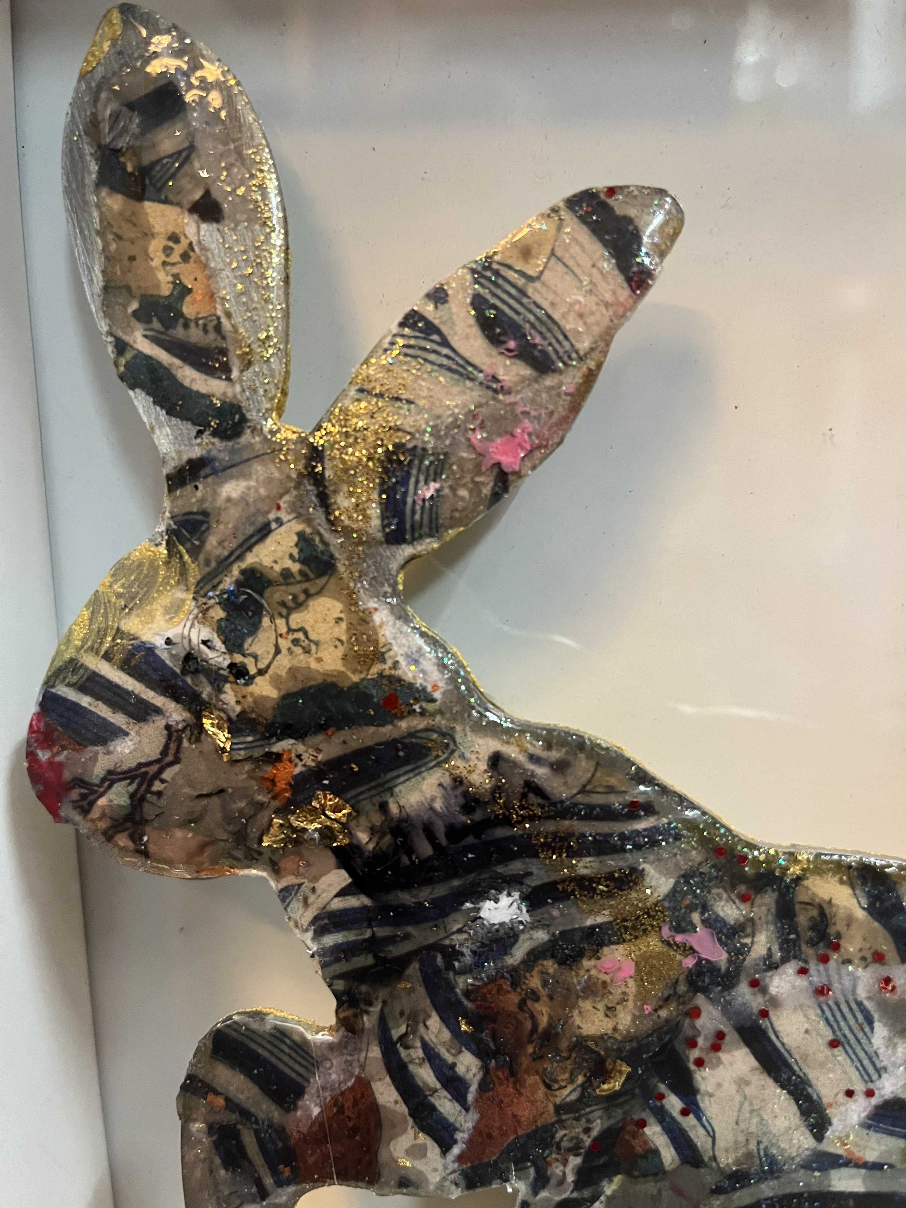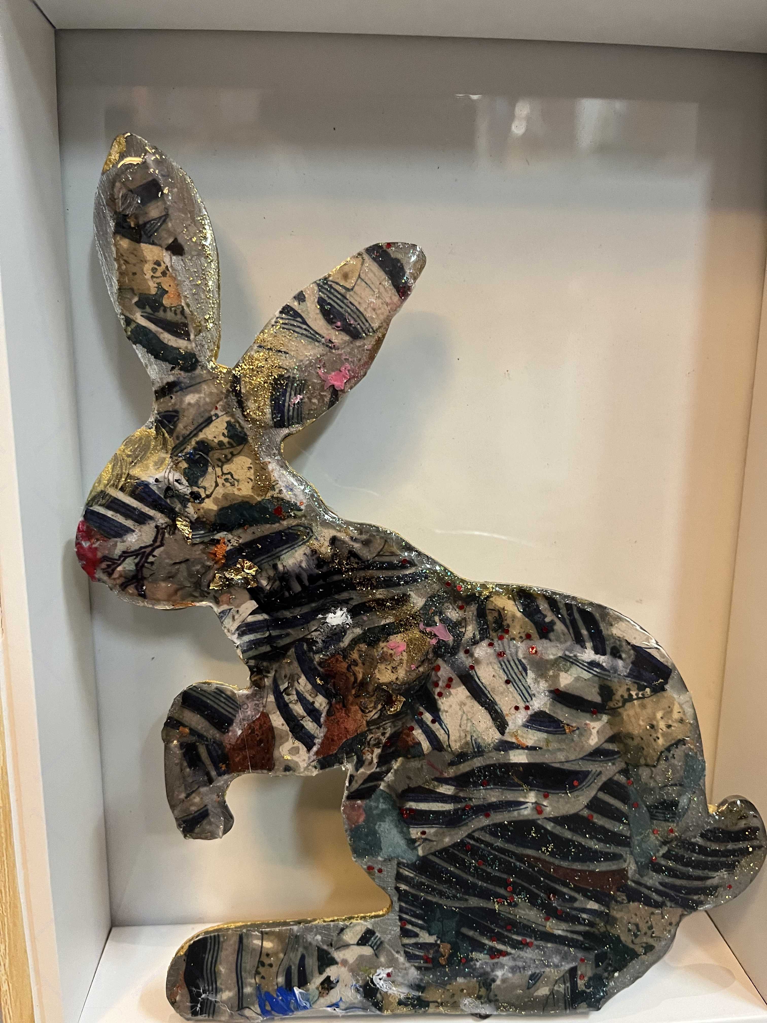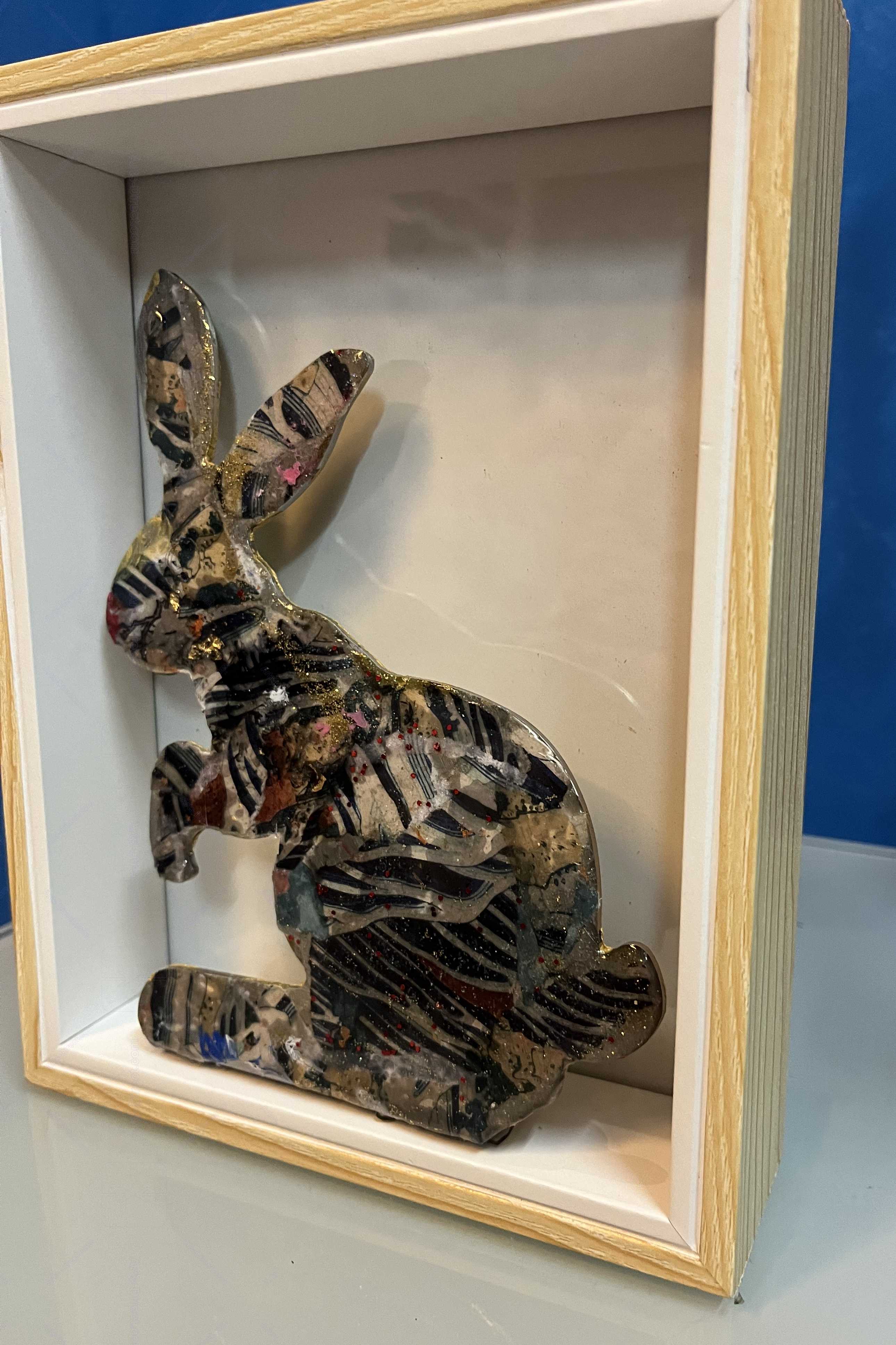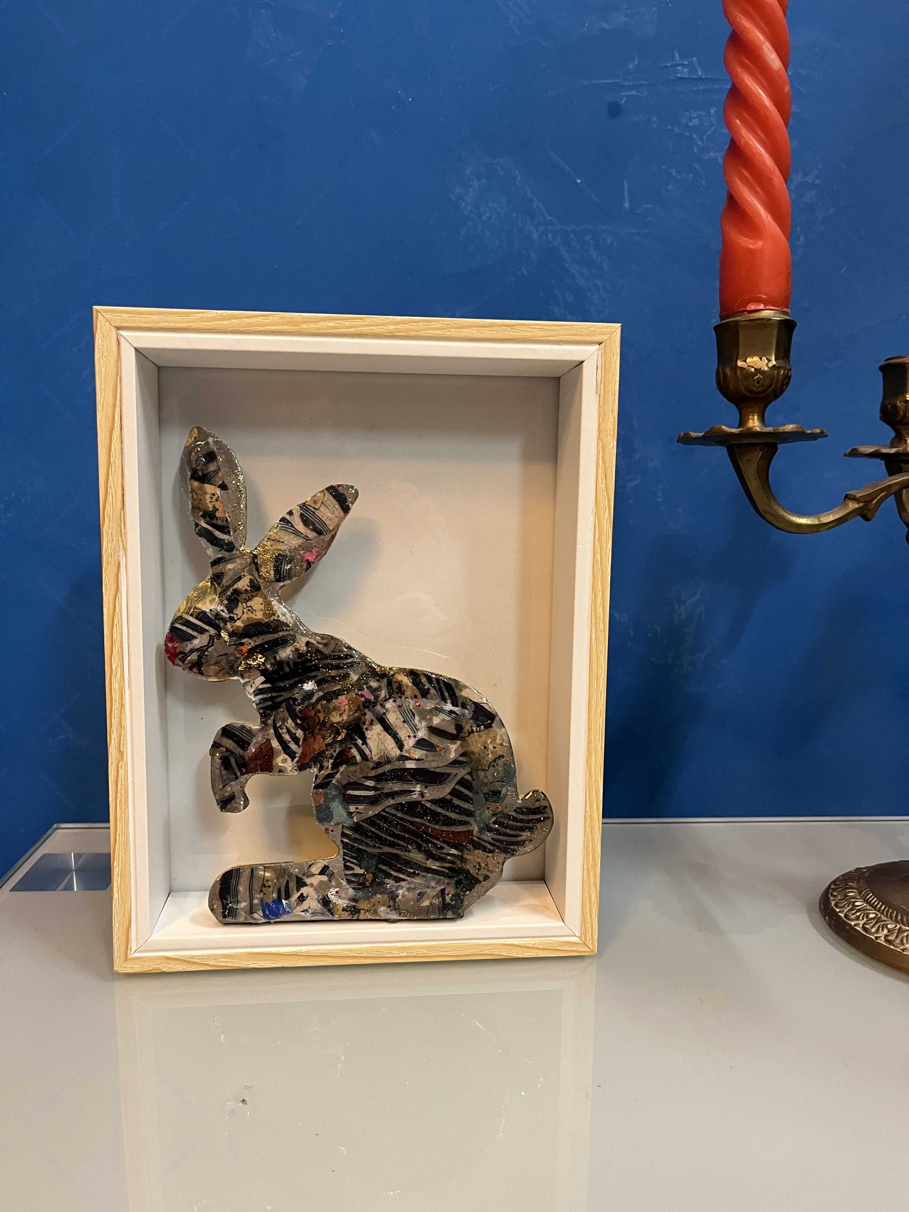 Dans son cadre ouvert en bois et verre , le lapin ( tigre et d'or ) en acier de 2 mm se dresse sur ses pattes arrière, peint et résiné. résistant , peint à l'arrière en or métallique !