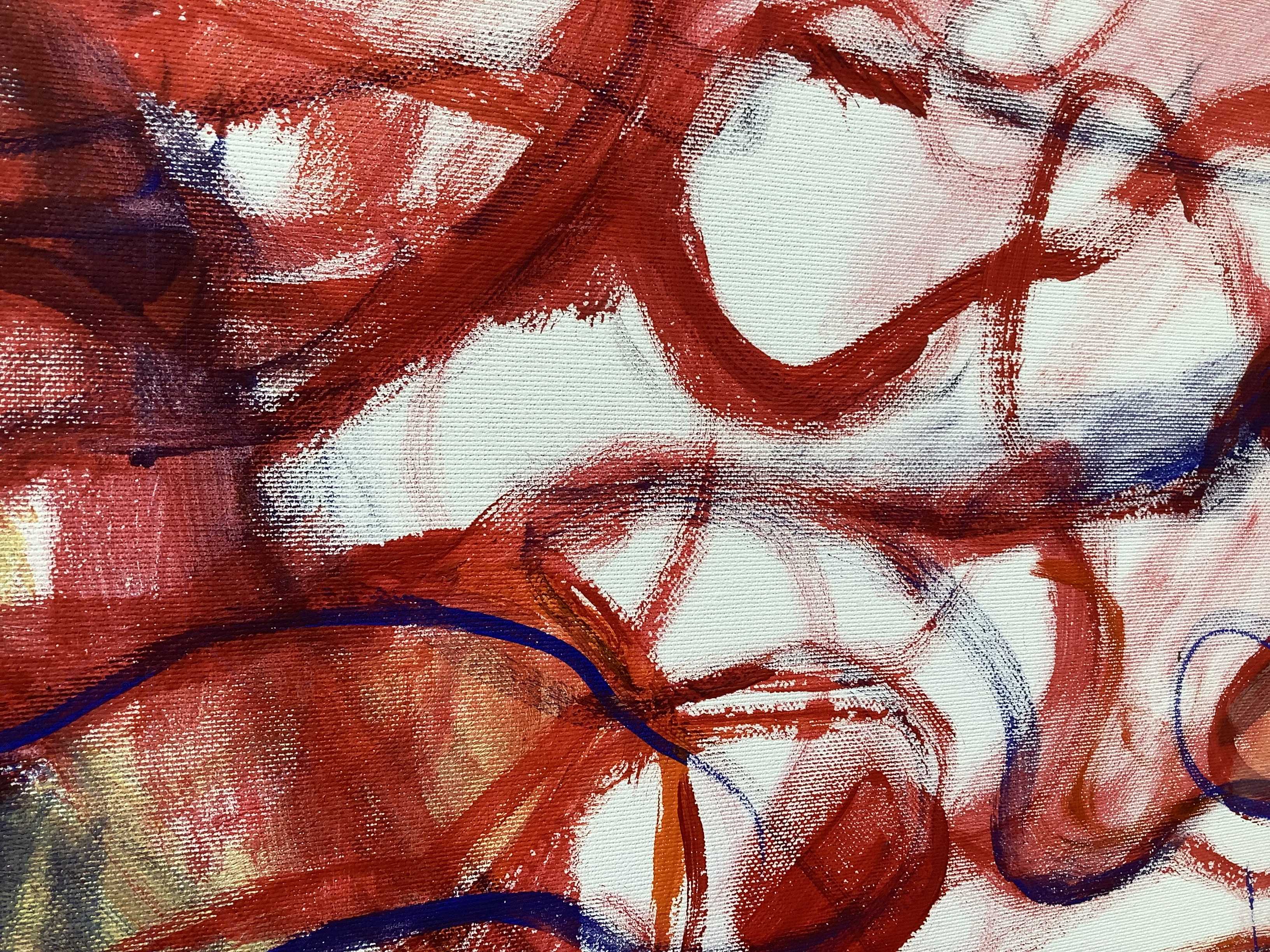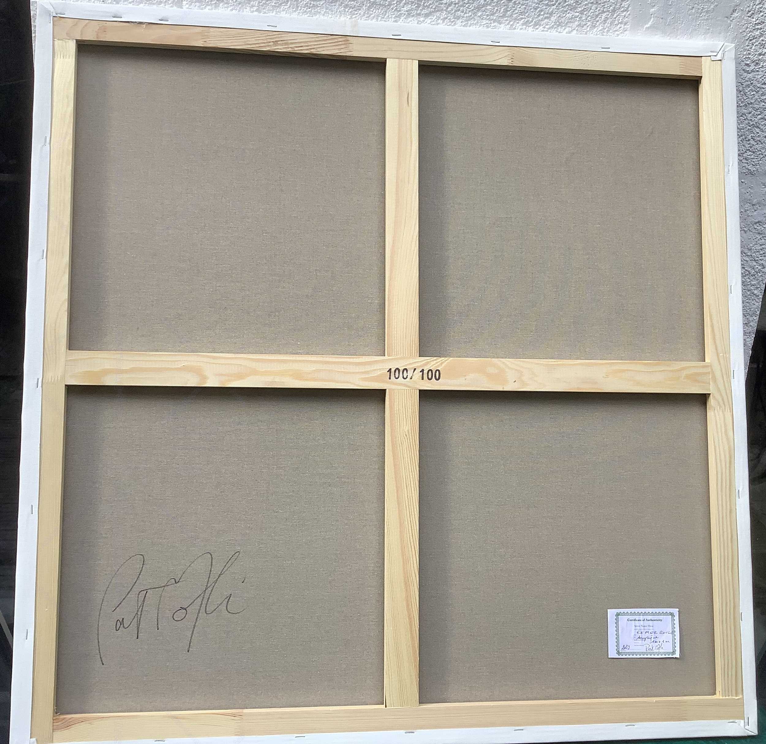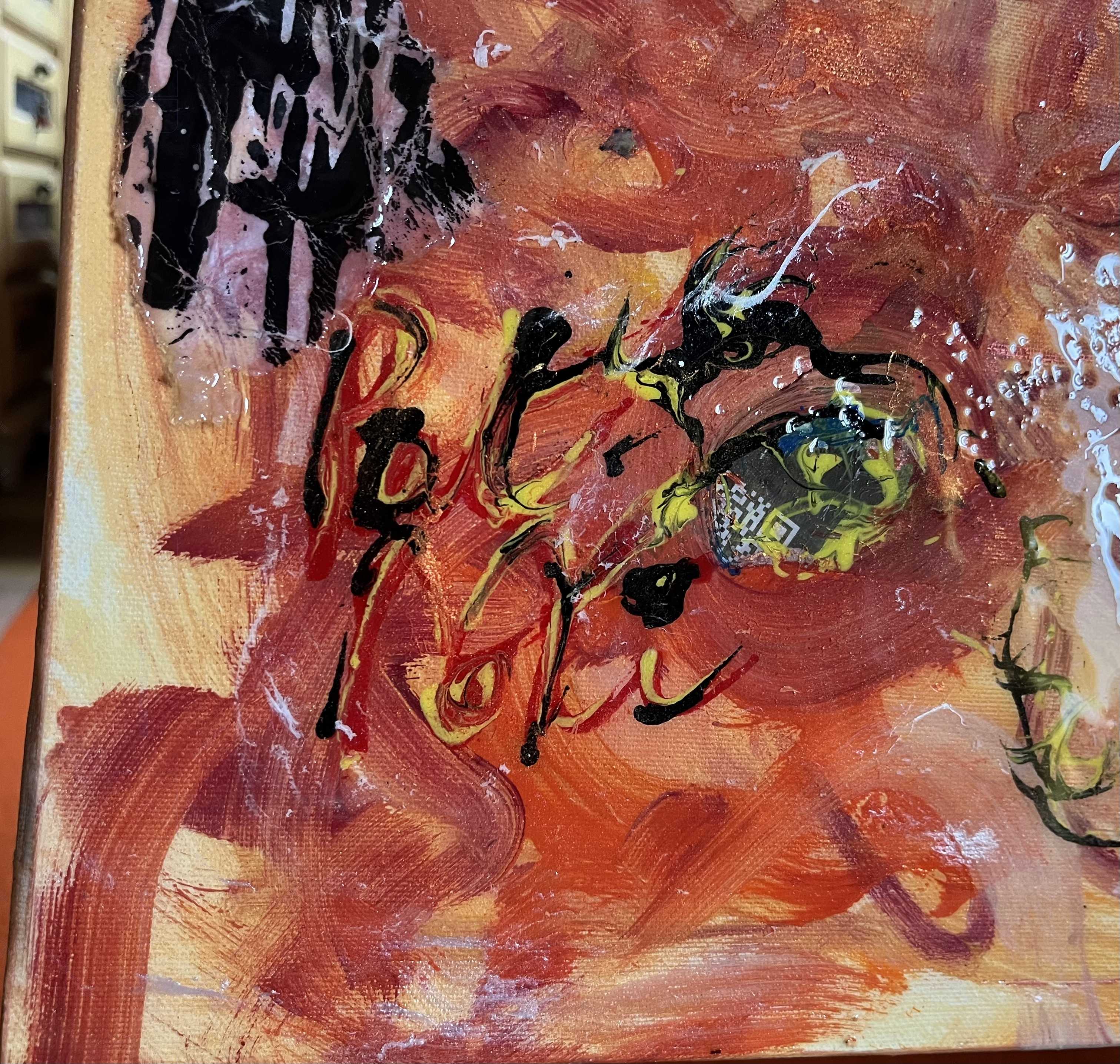 TOILE 130X80 cm.Cette création de PatMoli fait entrer ses contemplateurs de plain-pied dans son univers onirique de liberté, de légèreté, de rupture. Déconnecté des contingences physiques comme des apparences corporelles, son personnage est happé dans un flamboiement orange, sorte de tourbillon imaginaire, pris dans un jeu de particules avec lequel il semble jongler alors qu’il en est partie intégrante. Rebondissant comme sur un trempoline abyssal, il en ressort une sorte de joie ineffable de n’être accroché à rien, suspendu au néant dans une attitude improbable et tellement jubilatoire. Le bain orange ajoute à cette extase une chaude contingence dynamique, positive qui instille une bonne humeur impérative et nous invite à jouer avec lui. La toile entièrement résinée, comme sous l'eau, peut s'accrocher en vertical comme en horizontal ( 2 crochets ).