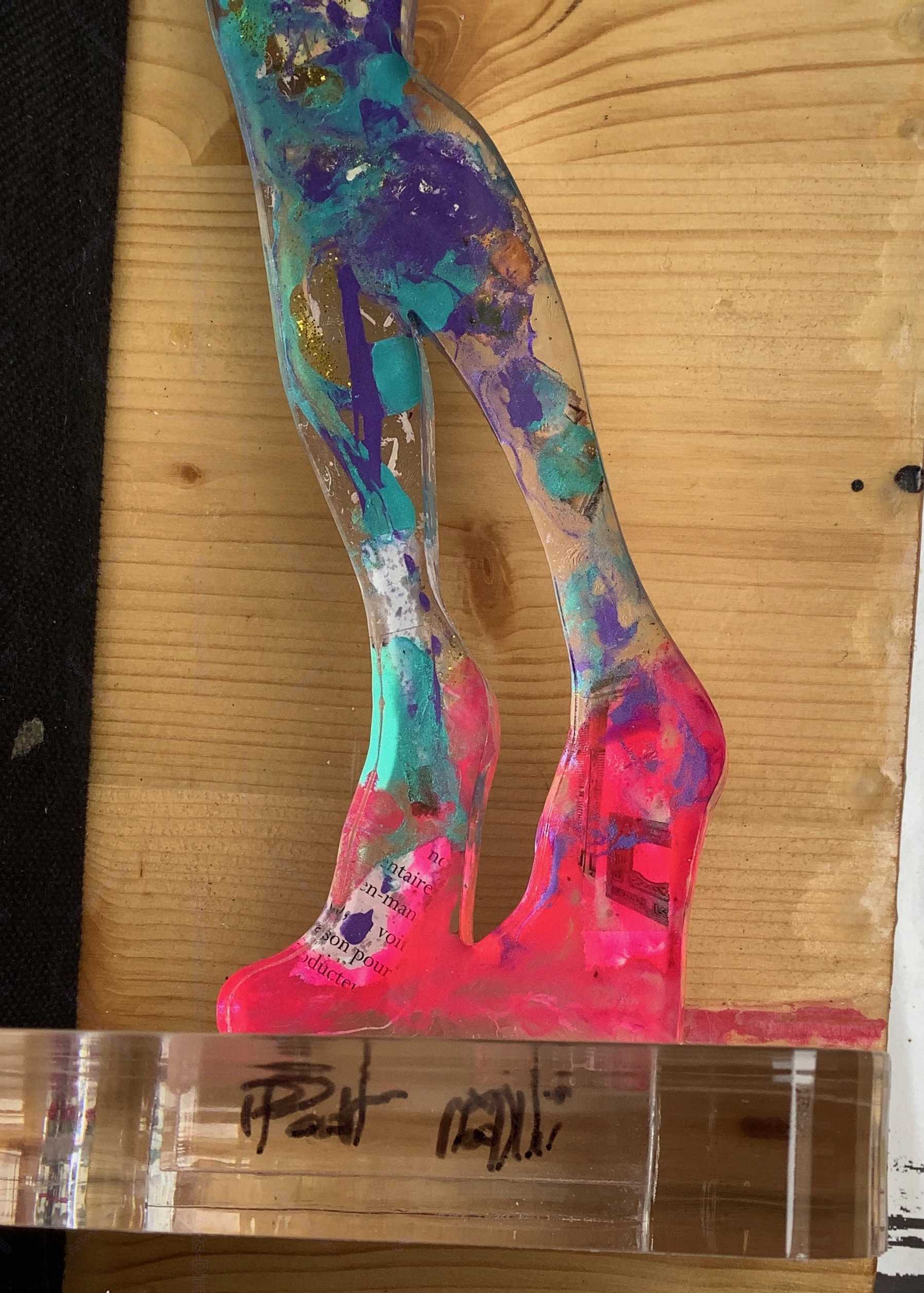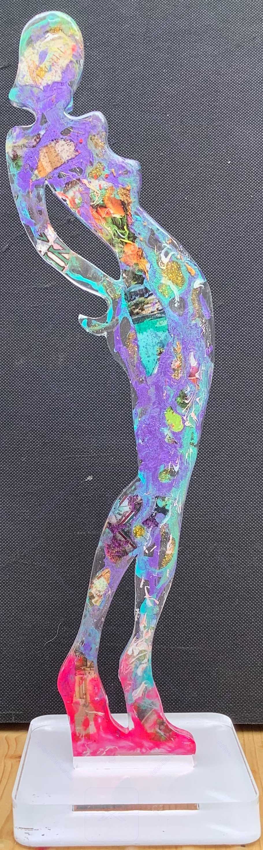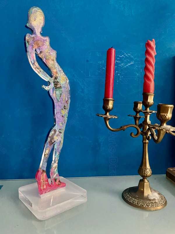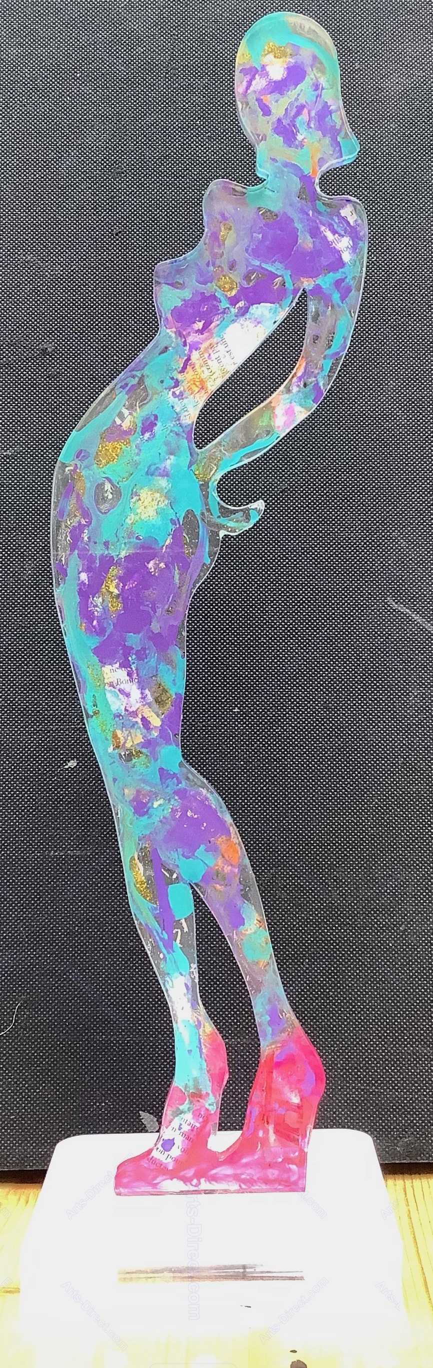 Cette silhouette de la femme élégante bleue joue avec la transparence du plexiglas de 8 mm d'épaisseur et le symbolisme des représentations.PatMoli invente des personnages expressifs qui font partie du quotidien, objets et partenaires à la fois. Dans une position décontractée, cette liane délicate nous appelle vers une introspection de la beauté et du mouvement. Elle se livre, complice, aux yeux des observateurs comme une invitation.