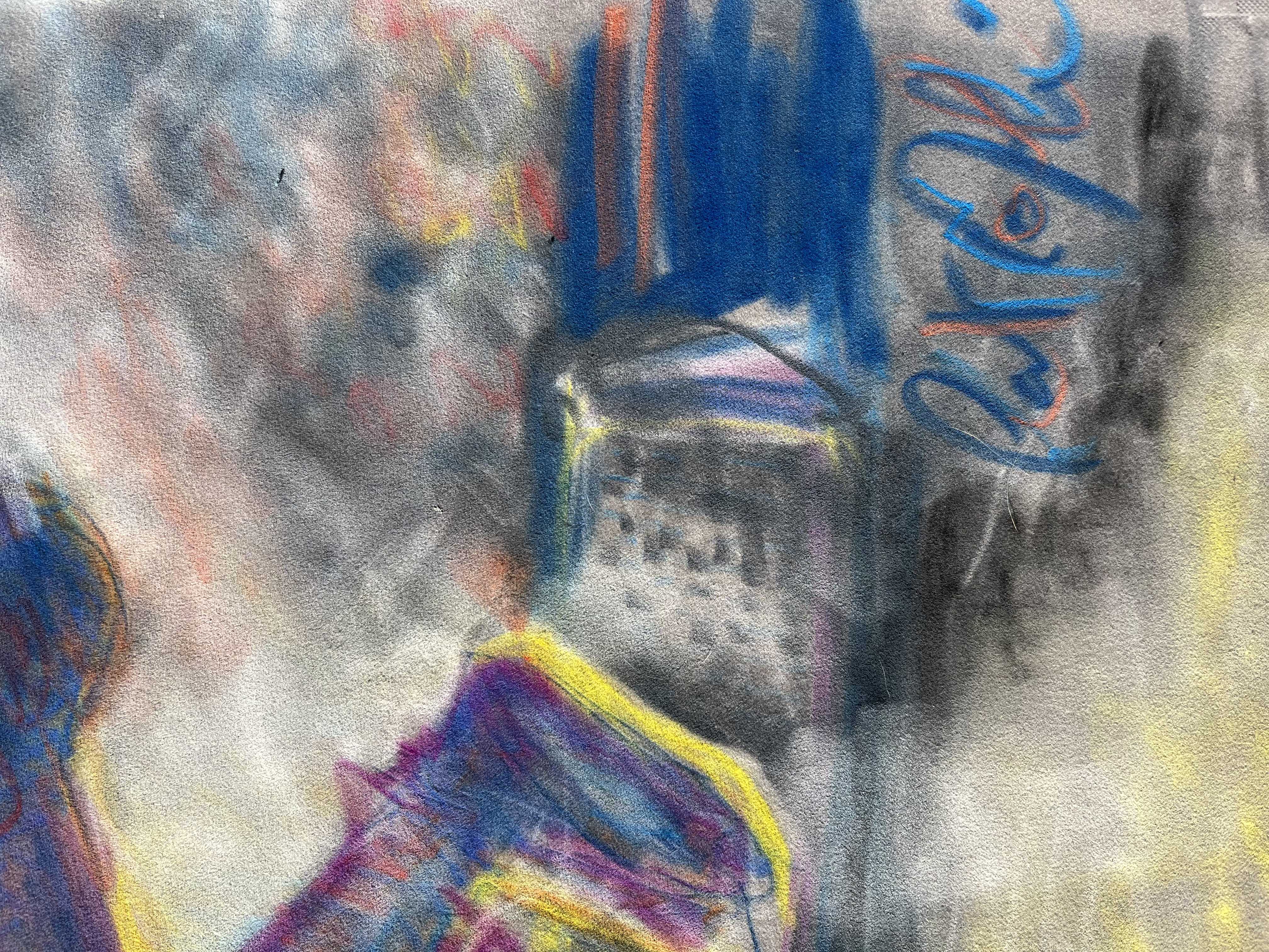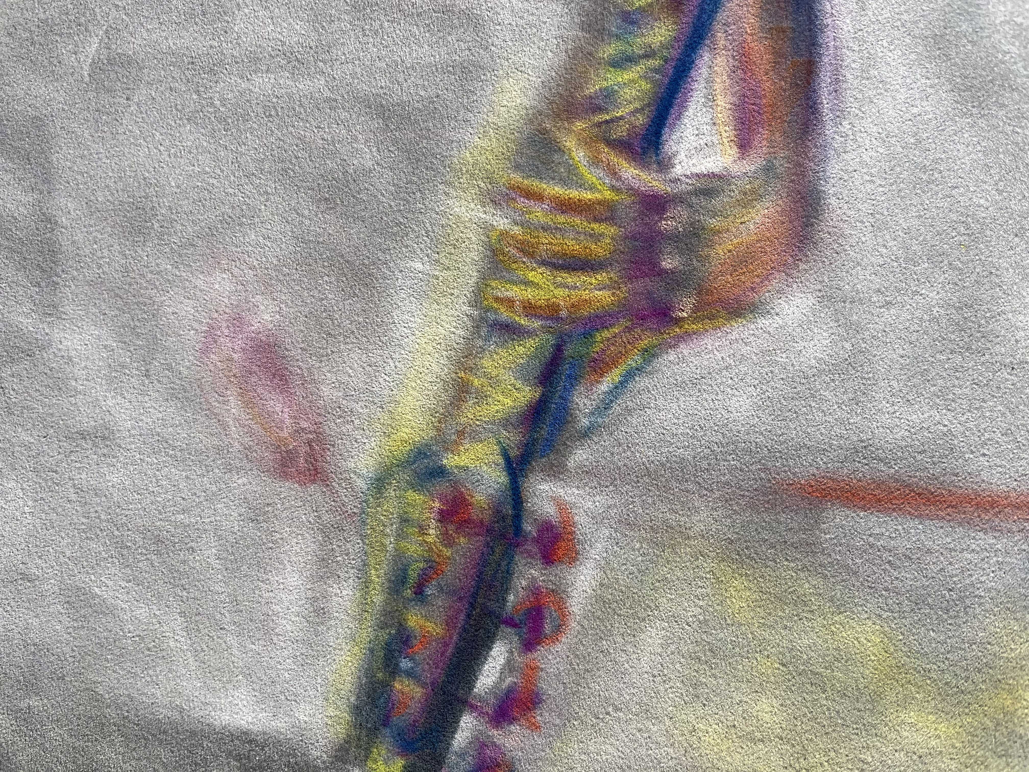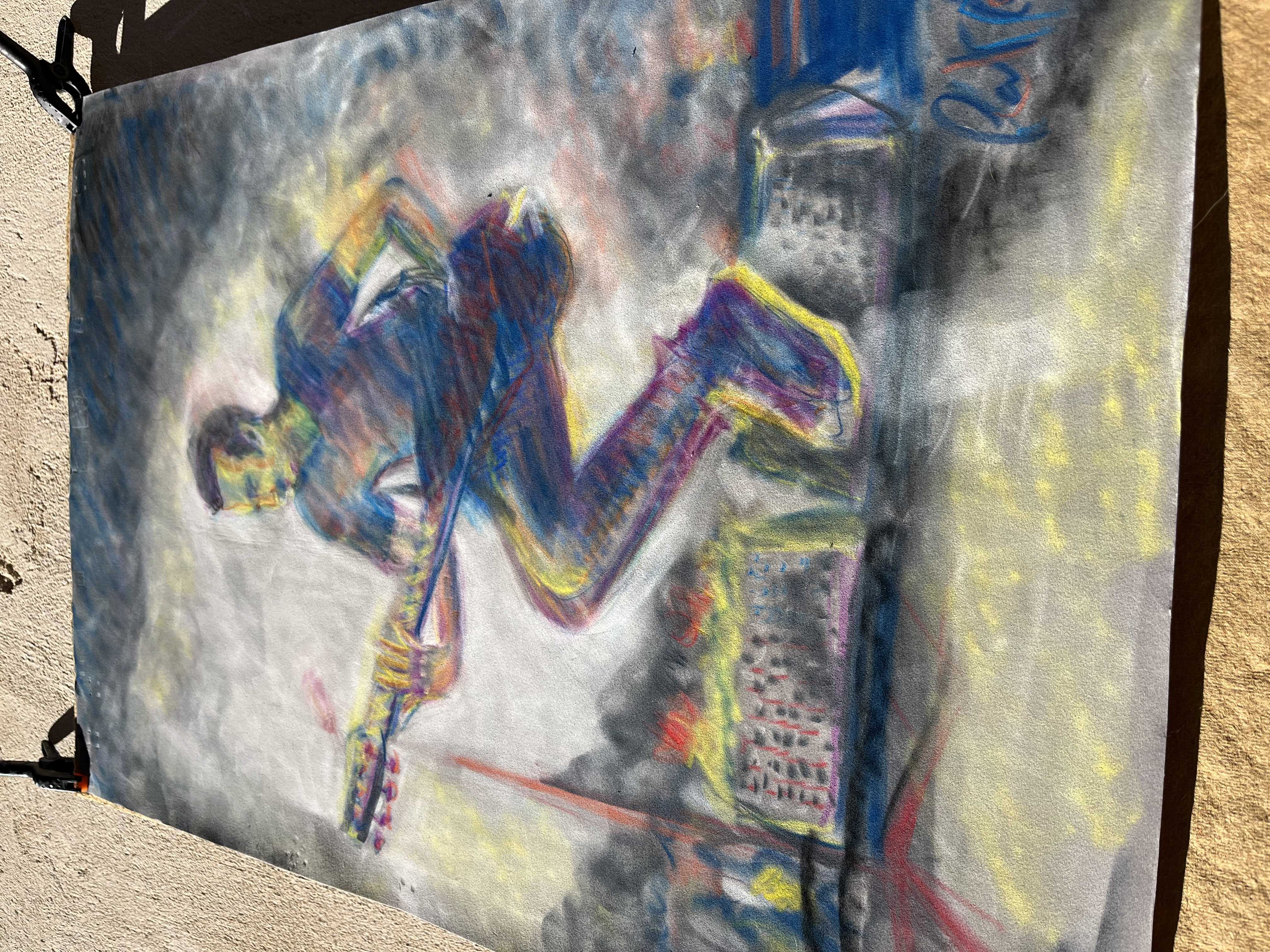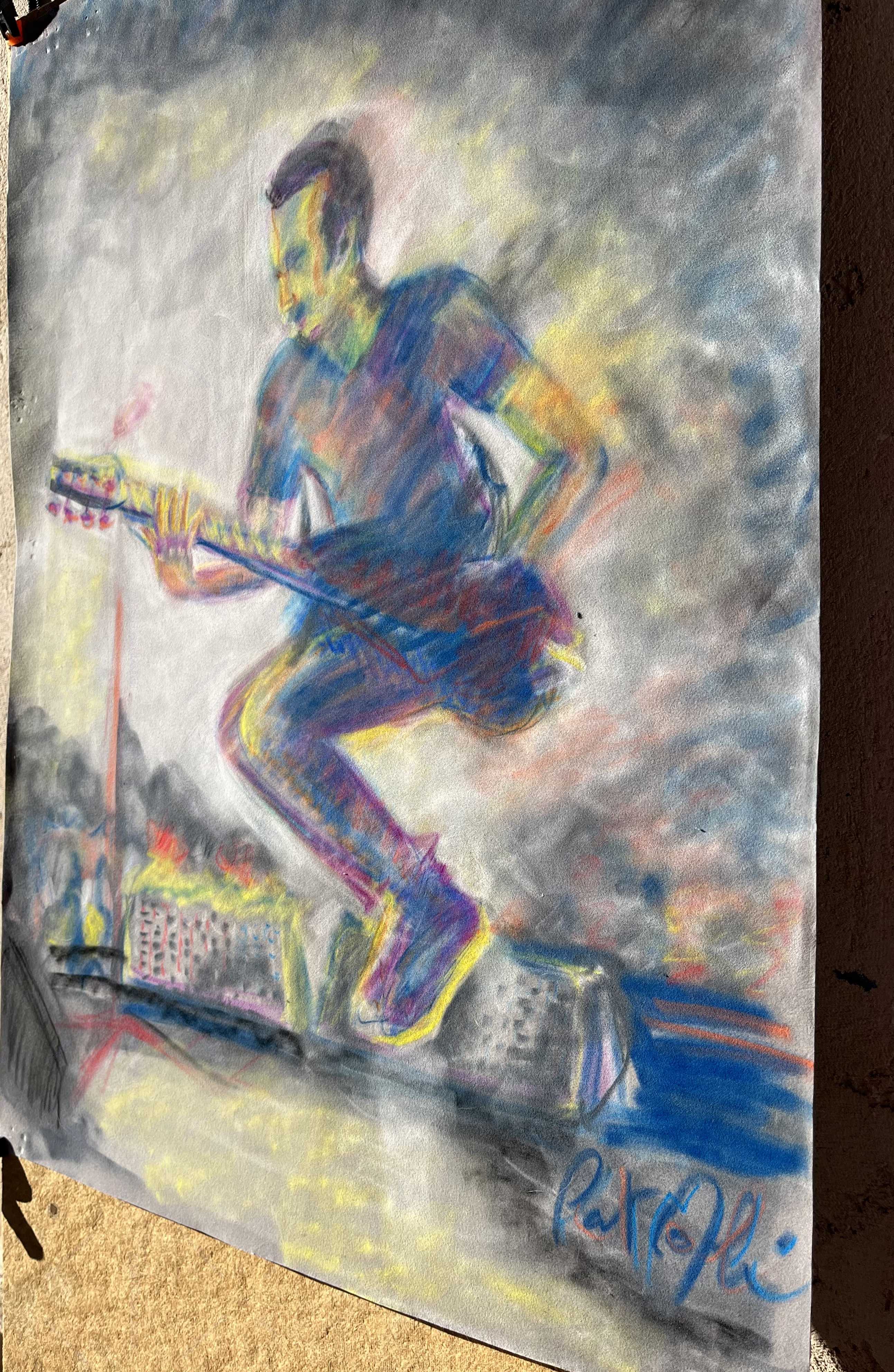 70X50 CM pastels sur feuille velours grise (prix négociable) . Inspirée par Calogero et son envol sur scène, j'ai cherché à capturer l'essence vibrante et l'énergie palpitante de sa musique. Utilisant des pastels pour mélanger fauvisme et du street art, j'ai projeté le dynamisme et la passion d'un guitariste en pleine performance, en apesanteur ! Les couleurs vives et les mouvements fluides soulignent les vibrations émotionnelles qui s'échappent de sa guitare.