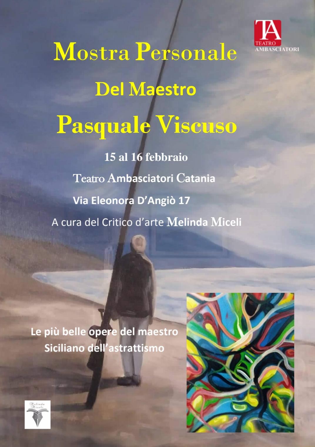 Il Teatro Ambasciatori di Catania dal 15 al 16 febbraio ospiterà la Mostra Personale del Maestro Pasquale Viscuso a cura del Critico d’arte Melinda Miceli presidente del Certamen internazionale sulle cattedrali e direttore artistico onorifico di Ars Magistris, Luz Cultural e Oscar delle arti. In Abstract exibition by Pasquale Viscuso saranno visibili le più belle opere del maestro Siciliano dell’astrattismo. La mostra è un grande evento per tutti gli spettatori e visitatori della Rassegna Teatrale di Prosa, per i collezionisti ed ammiratori di uno dei più grandi maestri dell’astrattismo contemporaneo.