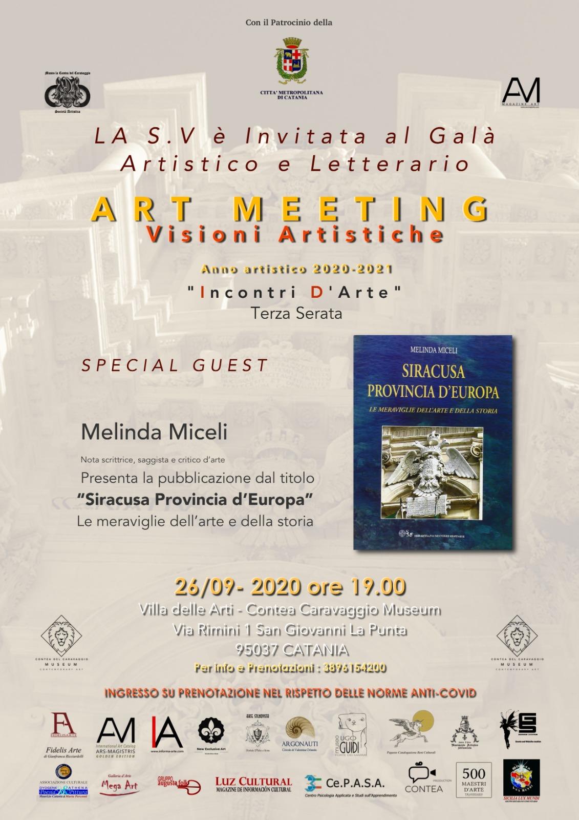 Sabato 26 Settembre presso Villa delle arti, Museo Contea del Caravaggio, si terrà un gran galà letterario che vede come protagonista la nota Scrittrice saggista poetessa e romanziera Melinda Miceli. La direzione di Ars Magistris è lieta di ripresentare al mondo la pubblicazione del critico d’arte Melinda Miceli dal titolo “Siracusa Provincia d’Europa” – le meraviglie dell’arte e della storia che andrà in onda in anteprima mondiale in streaming su Explorer of art. Il pregiatissimo libro va riesumato per la conoscenza vera della storia delle colonie greche in Sicilia e per festeggiare la nuova pubblicazione internazionale dell'autrice di cui diamo anteprima assoluta." La cattedral del alma" edito Matrioska il nuovo romanzo iniziatico di Melinda Miceli sarà pubblicato il 1 novembre e diffuso in Spagna e tutta l'America Latina.