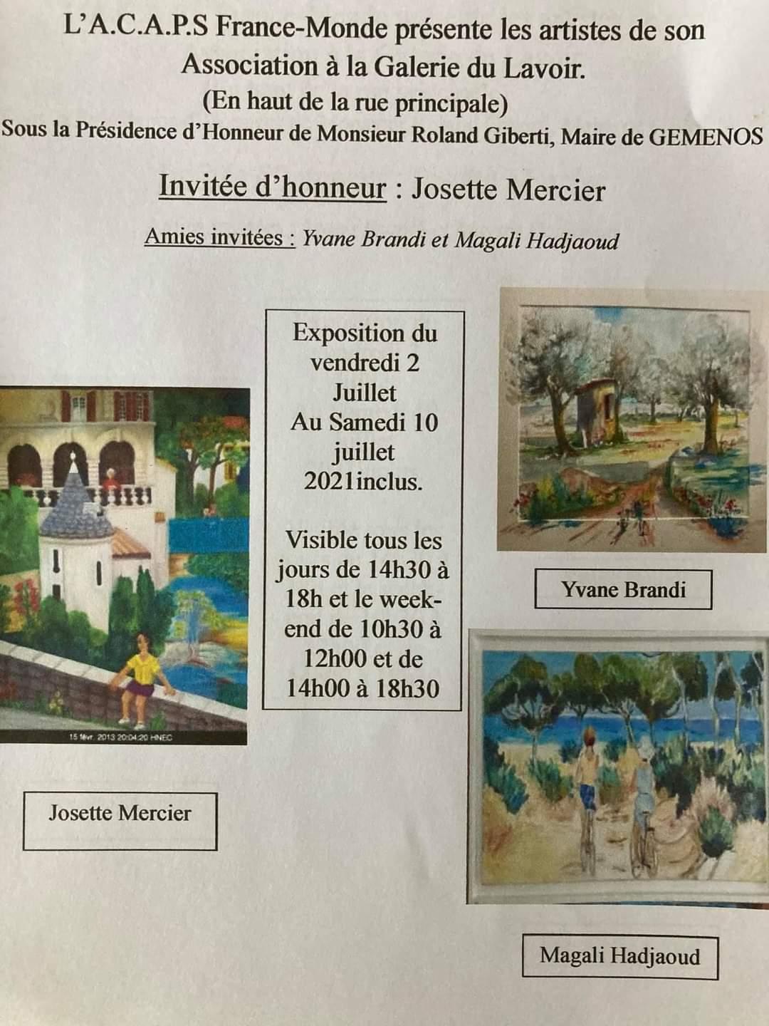 Exposition de peinture du 2 juillet au 10 juillet. Salle du lavoir à Gemenos
